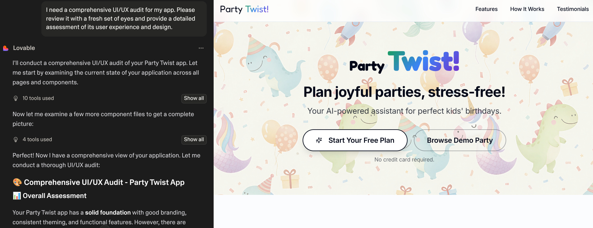 But as a lovely surprise, Lovable gifted me 25 credits. So here I am, vibing rogue and building my birthday party planner anyway. đ